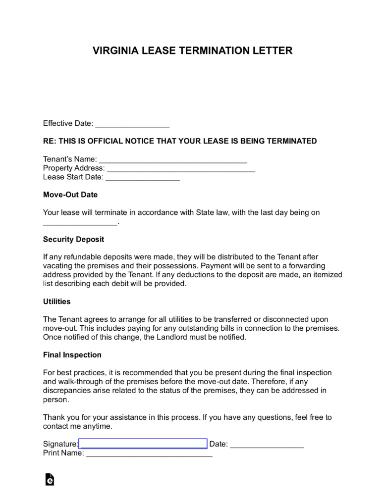 Virginia Lease Termination Letter Form | 30-Day Notice