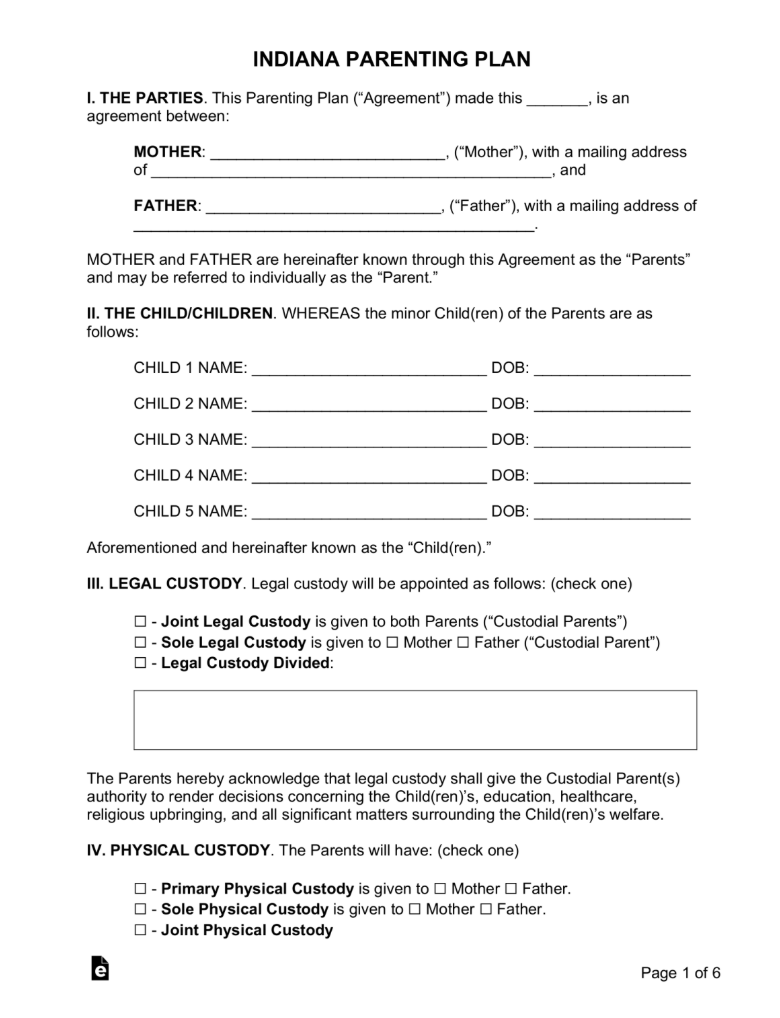 Indiana Custody (Parenting) Plan