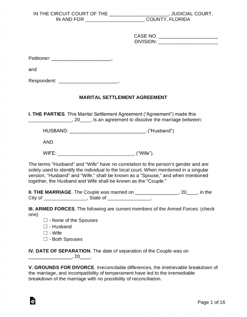 Florida Marital Settlement (Divorce) Agreement