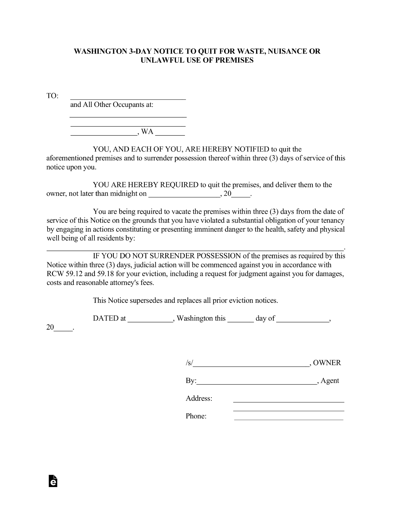 Washington 3-Day Notice to Quit Form - Illegal Activity
