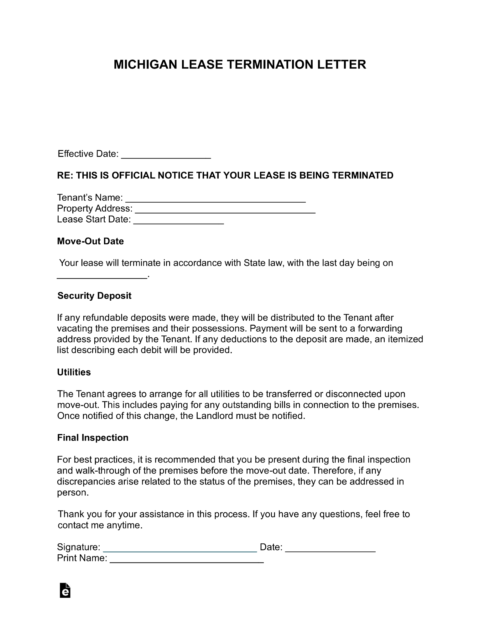 Michigan Lease Termination Letter Form | 30-Day Notice