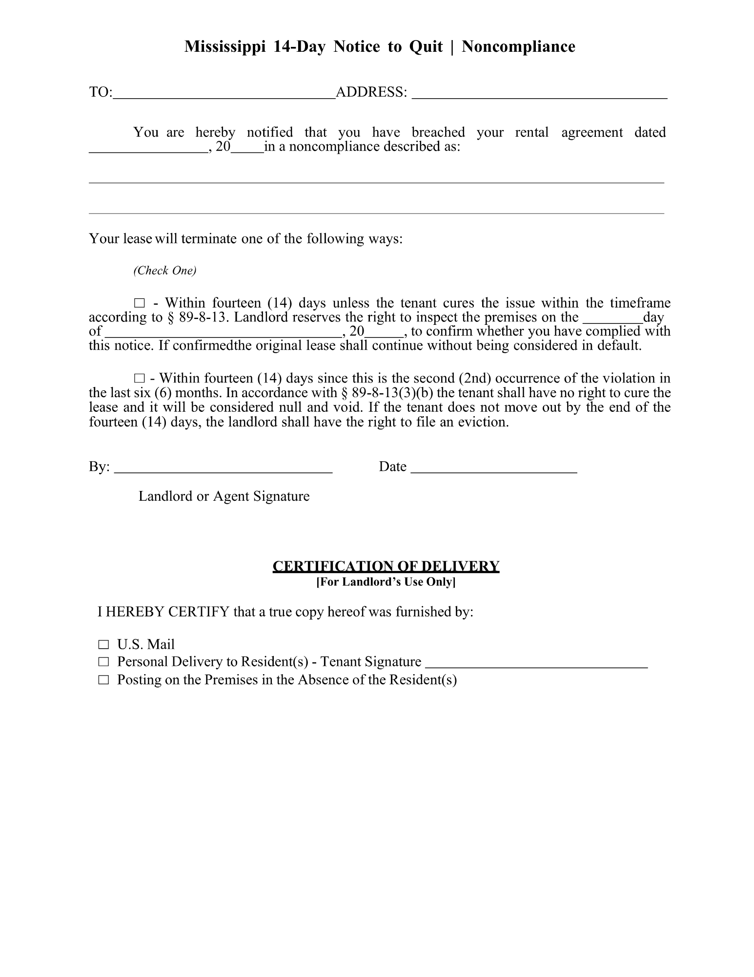 Mississippi 14 Day Notice to Quit Form