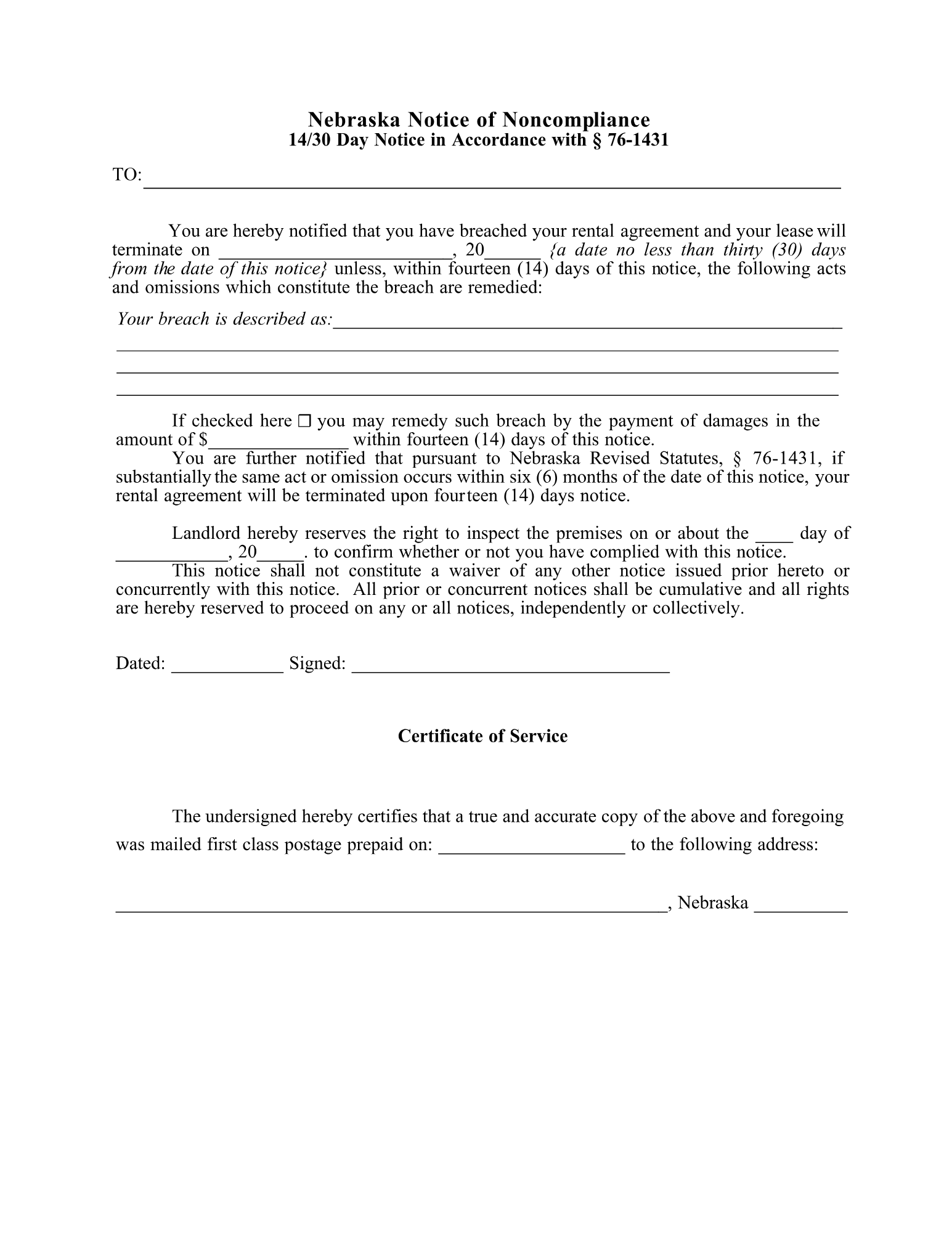 Nebraska 30-Day Notice To Quit