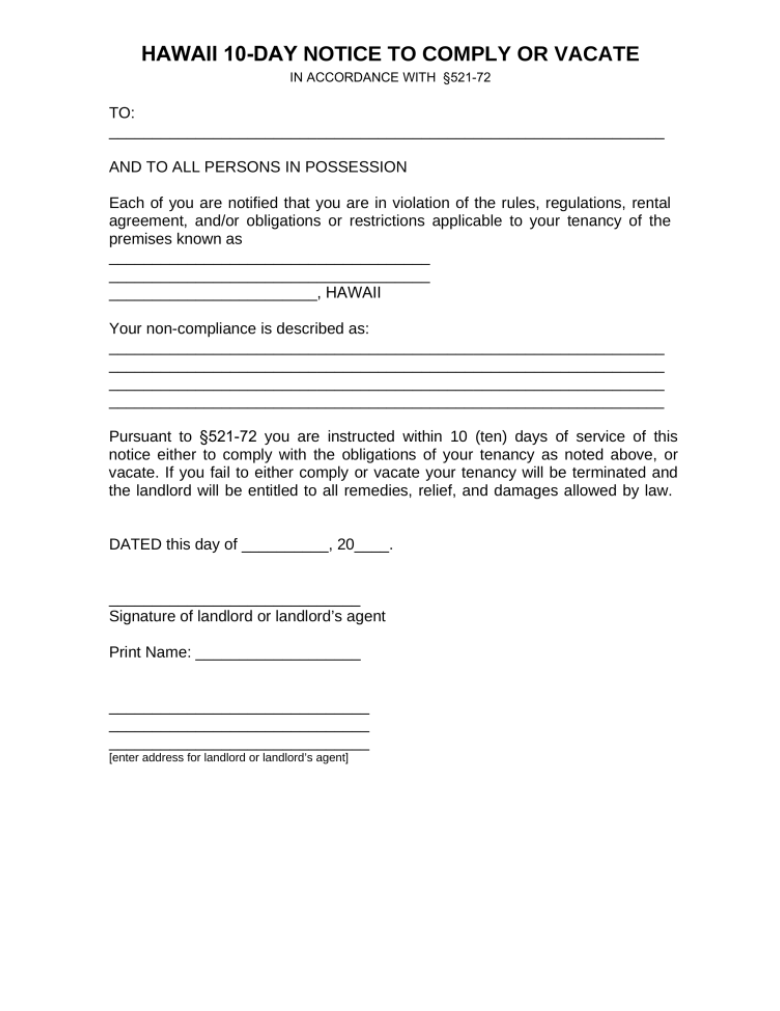 Hawaii 10-Day Notice to Quit Form | Non-Compliance