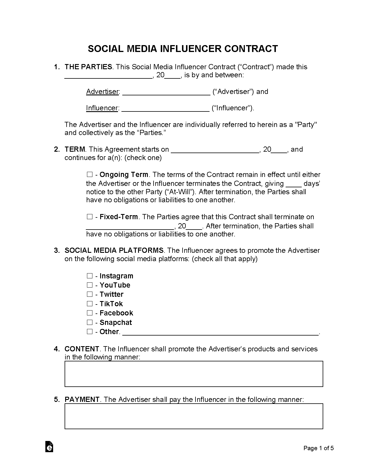 Hello, I own a real estate company and I'm hiring an influencer for marketing purposes. In exchange for a marketing fee when the advertised property is sold, can you tell me what kind of contract I need and what laws apply?