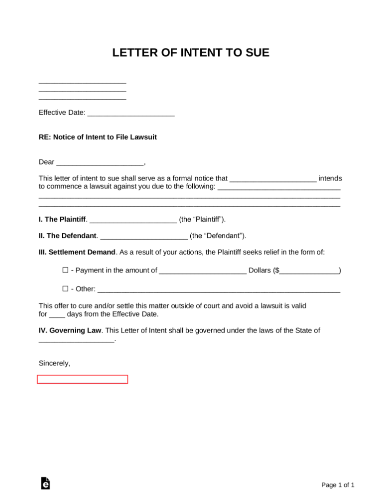 Letter of Intent to Sue (with Settlement Demand) | Sample