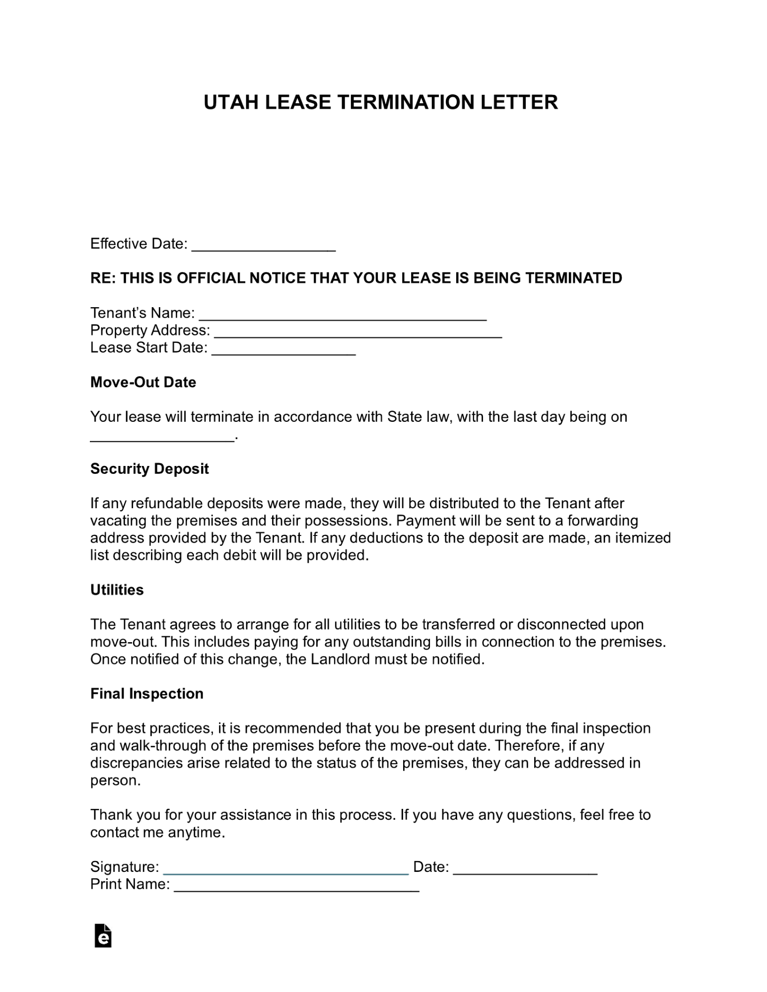 Utah Lease Termination Letter